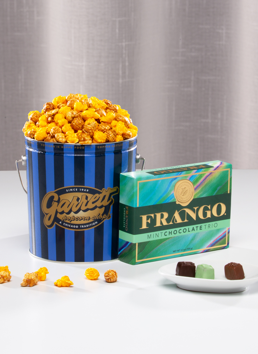 Share a taste of the Windy City with two Chicago favorites in one gift set. Snack on our world-famous Garrett Mix when you are looking for a sweet and savory perfection. We hot-air pop the original Chicago-style cheddar cheese popcorn and caramel popcorn right in our kitchen. Indulge in a simple luxury with our new Frango Chocolate gift boxes. Treat yourself to a 15-piece box of your choice of Frango Chocolate: Milk Chocolate Mint or Mint Chocolate Trio.